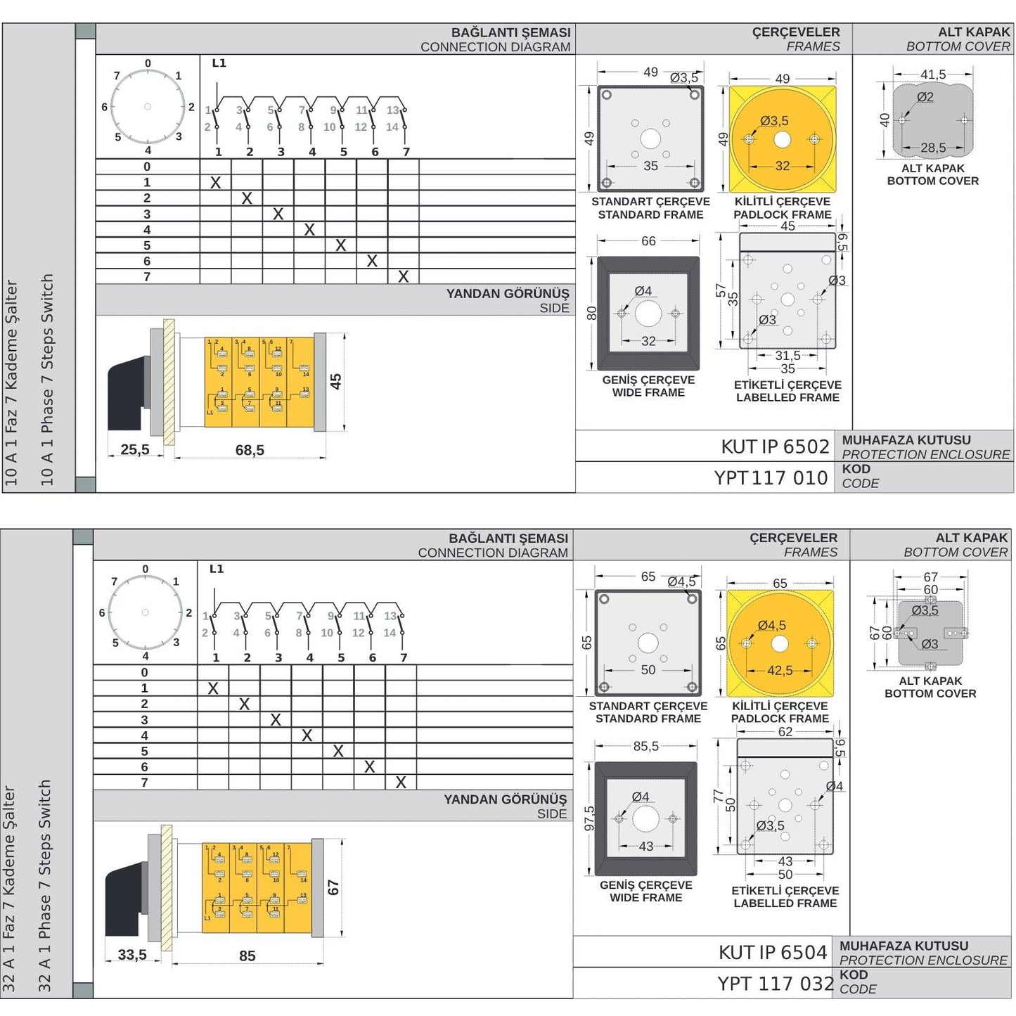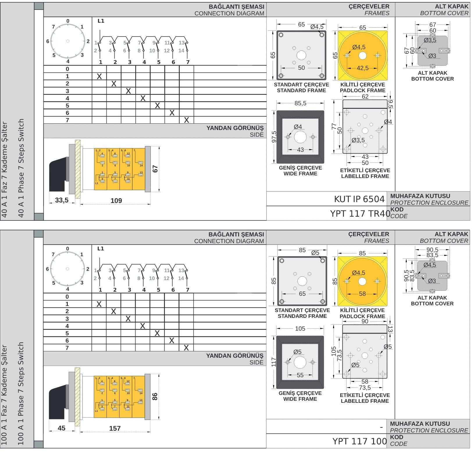 Stopenjsko stikalo 0-1-2-3-3-4-5-6-7, vrtljivo stikalo, 1 pol, 10-160A, YPT117 proizvajalec OPAŞ (Turčija)